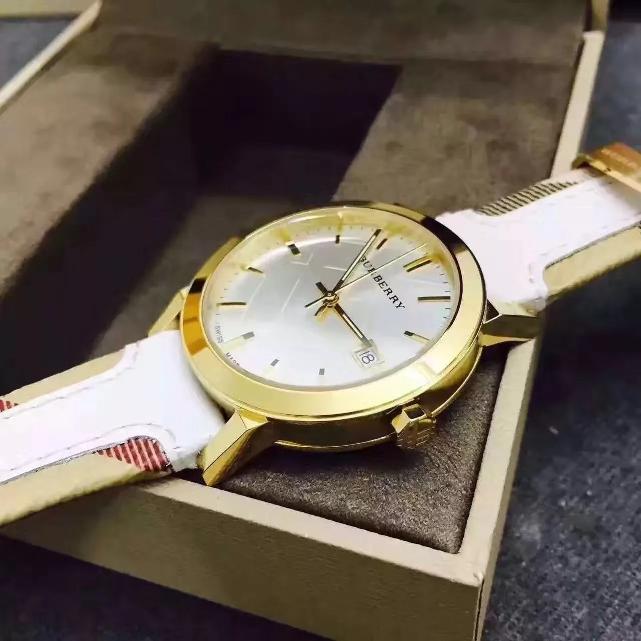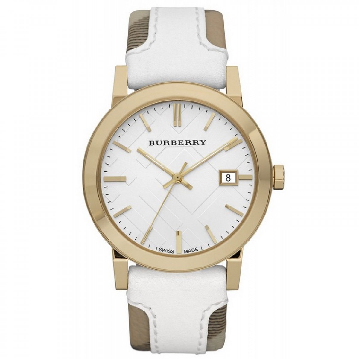 BURBERRY BU9110 is a classic English-style watch for women who love comfortable chic. The gold case is set with white dial with signature check engraving. Sophisticated white leather strap is decorated with iconic House check trim. Features a date window. Swiss made and powered by Quartz. Water-resistant and protected by sapphire glass against mechanical damage. Classy and aristocratic, this watch will be your most stylish companion for any occasion.