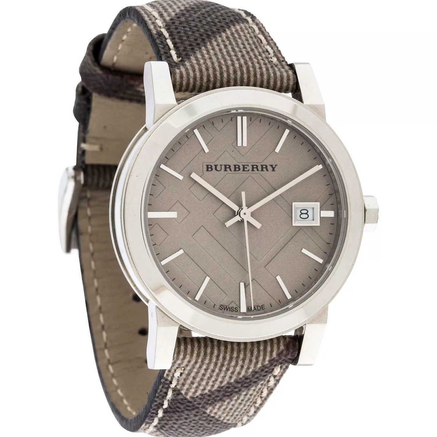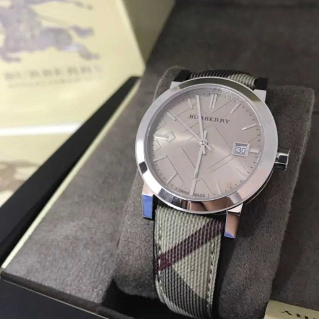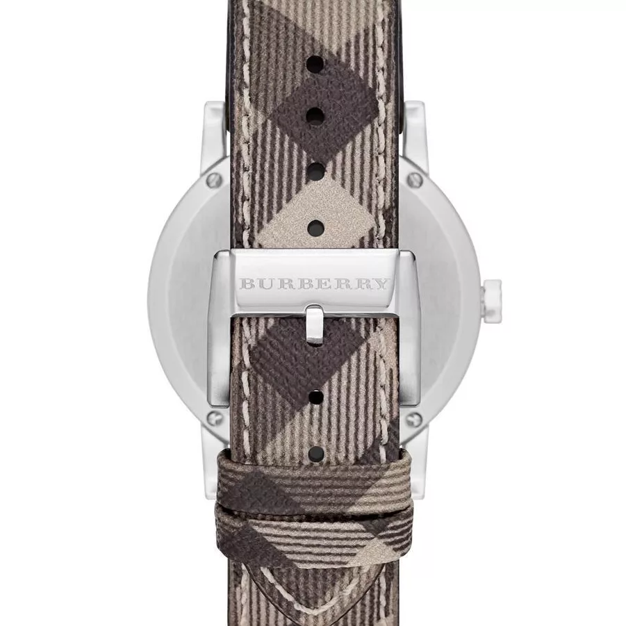 BURBERRY BU9118 is the iconic smoke check strap comfortable watch. Silver stainless steel case is set with signature engraving while dark beige leather strap stand out for its aesthetics. Features a date window. Swiss made and powered by Quartz. Water-resistant and protected by sapphire glass against mechanical damage. An exquisite accessory that exudes great taste.