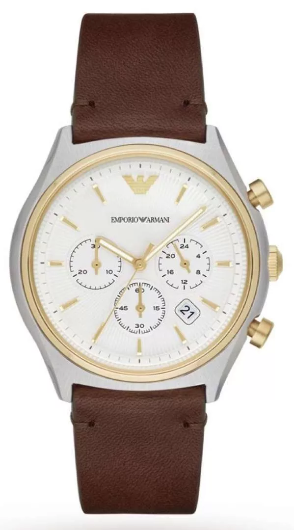 Emporio Armani AR11033 is a watch for men who appreciate comfortable functionality. Silver steel case with rich gold bezel is fitted with handsome brown leather strap. Cream colored dial is adorned by three subdials and gold detailings and feature the date window. Secured by a buckle clasp for your ultimate comfort. Powered by Quartz. Water-resistant and protected by mineral glass to ensure you a long quality service.”