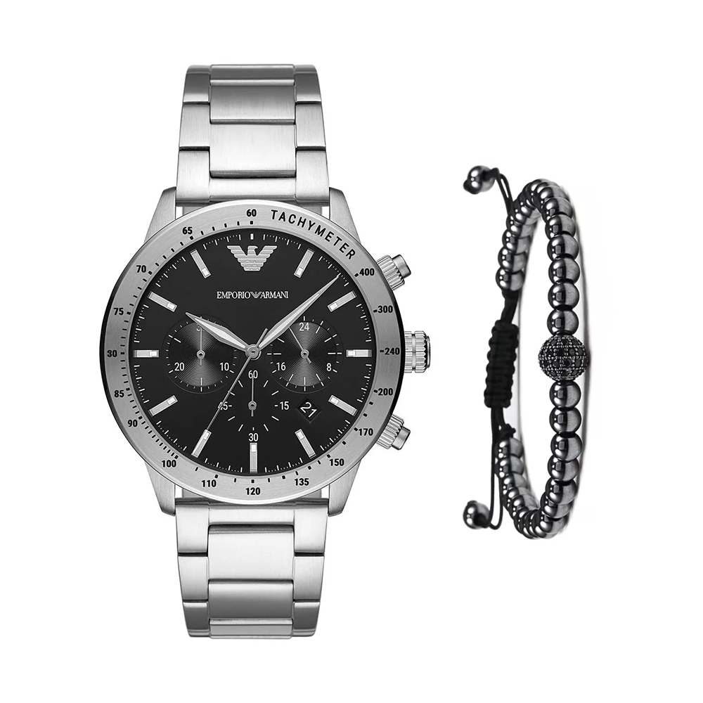 Emporio Armani AR11241 is a timepiece that exudes boldness and confidence. Silver stainless steel case with a 43mm black dial and chronograph makes up a reliable accessory that will elevate your style and match your character. Features a tachymeter function. Water-resistant and scratch-resistant for a more practical wear. For men who know how to make a statement.