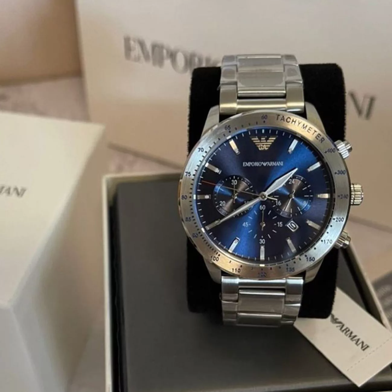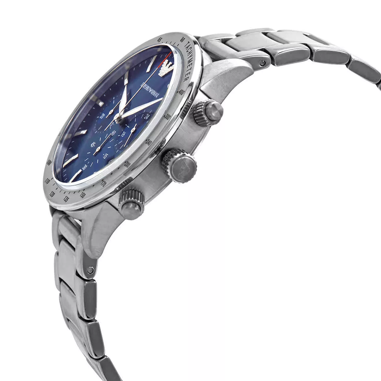 The Emporio Armani AR11306 is a strong and confident model for men who lead an action-packed lifestyle. Solid stainless steel silver case combined with a luminous blue dial and chronograph. Features a tachymeter on the outer rim. Water-resistant and scratch-resistant for a more practical wear. Can be submerged up to 50 meters deep. Great fit for a man who wants to display his spirit and character.