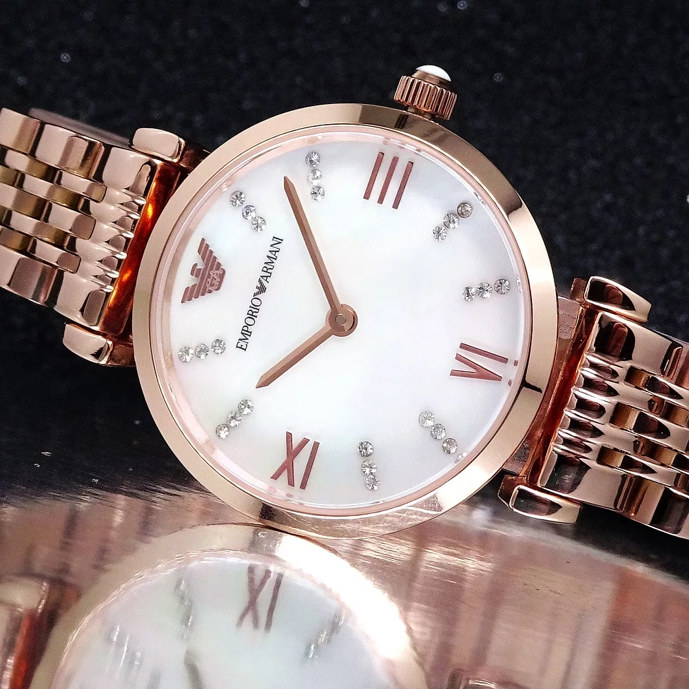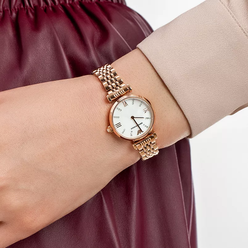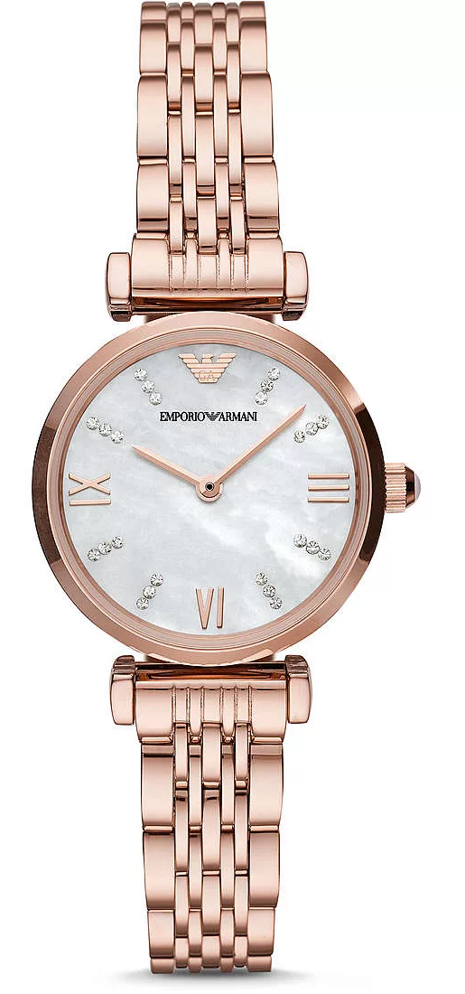 Emporio Armani is an elegant watch with a delicate mother-of-pearl dial encrusted with sparkling crystals. Crafted in trendy rose gold stainless steel this watch stands out for its beautiful design. Roman numerals add an extra flair of refinery and taste. Powered by Quartz. Water-resistant and protected by mineral glass to ensure you a long quality service. This model will highlight your sophisticated style and will be an absolute favorite among your accessories.”