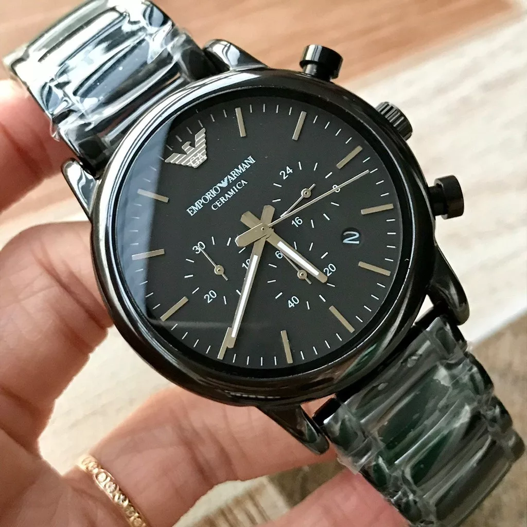 Emporio Armani AR1507 is a refined minimalism accessory for men. The watch case is made of ceramics with a jet black coating. Matte black dial is decorated with three subdials with unique design and contrasting silver indexes and hands. Features a date window and a stopwatch. Powered by Quartz. Water-resistant and protected by mineral glass to ensure you a long quality service. The perfect staple for a confident man’s wardrobe.
