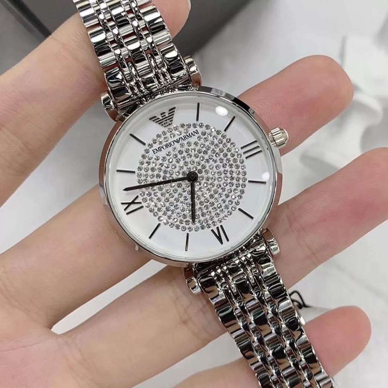 Emporio Armani AR1925 is a bedazzling beauty for women who love to shine. Subtle silver bracelet and a snow white dial with glowing inlay. Roman numerals on the hour markings add gravitas.The scratch-resistant dial is protected by a mineral glass. Powered by Quartz. Perfect accessory to stand out among the crowd and highlight your vibrant style with confidence. This ultra-bold and eye-catching statement will become an absolute staple in your wardrobe.