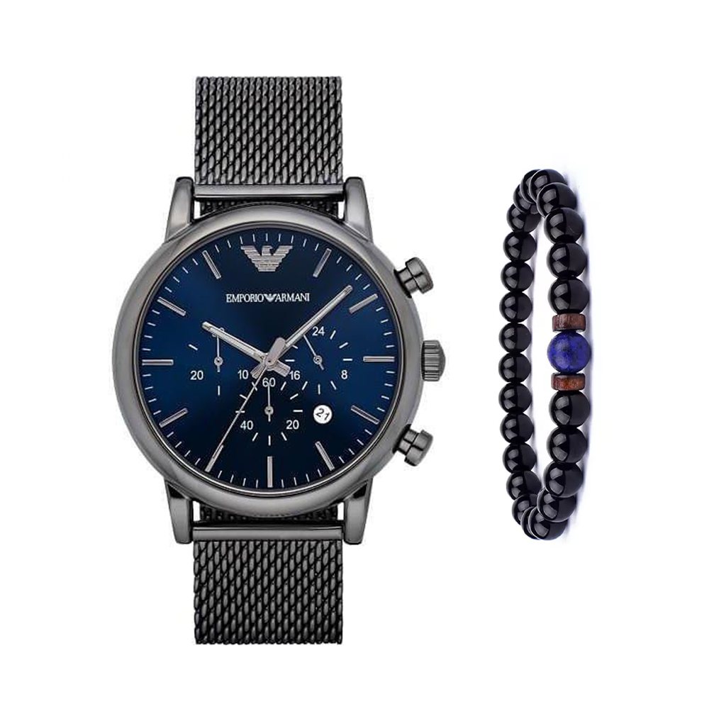 Emporio Armani AR1979 is a stylish classic chronograph for every day. Grey polished Milanese loop stainless steel bracelet 46 mm luminous blues dial with three subdials and a date section create an unforgettable image that will make you stand out from the crowd. Features minute markers around the outer rim. Don’t worry about getting your hands wet. This watch is waterproof and scratch-resistant for a more practical wear. Powered by Quartz. Timeless and attractive this timepiece will become your Holy Grail of watches.