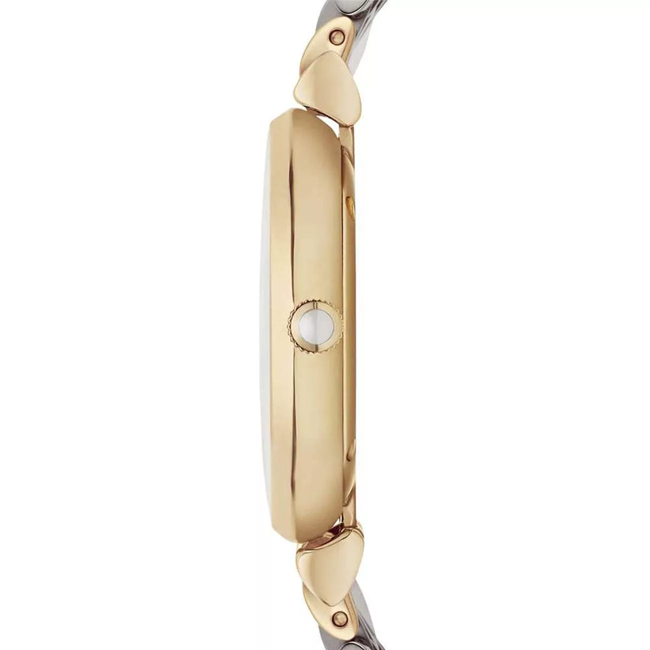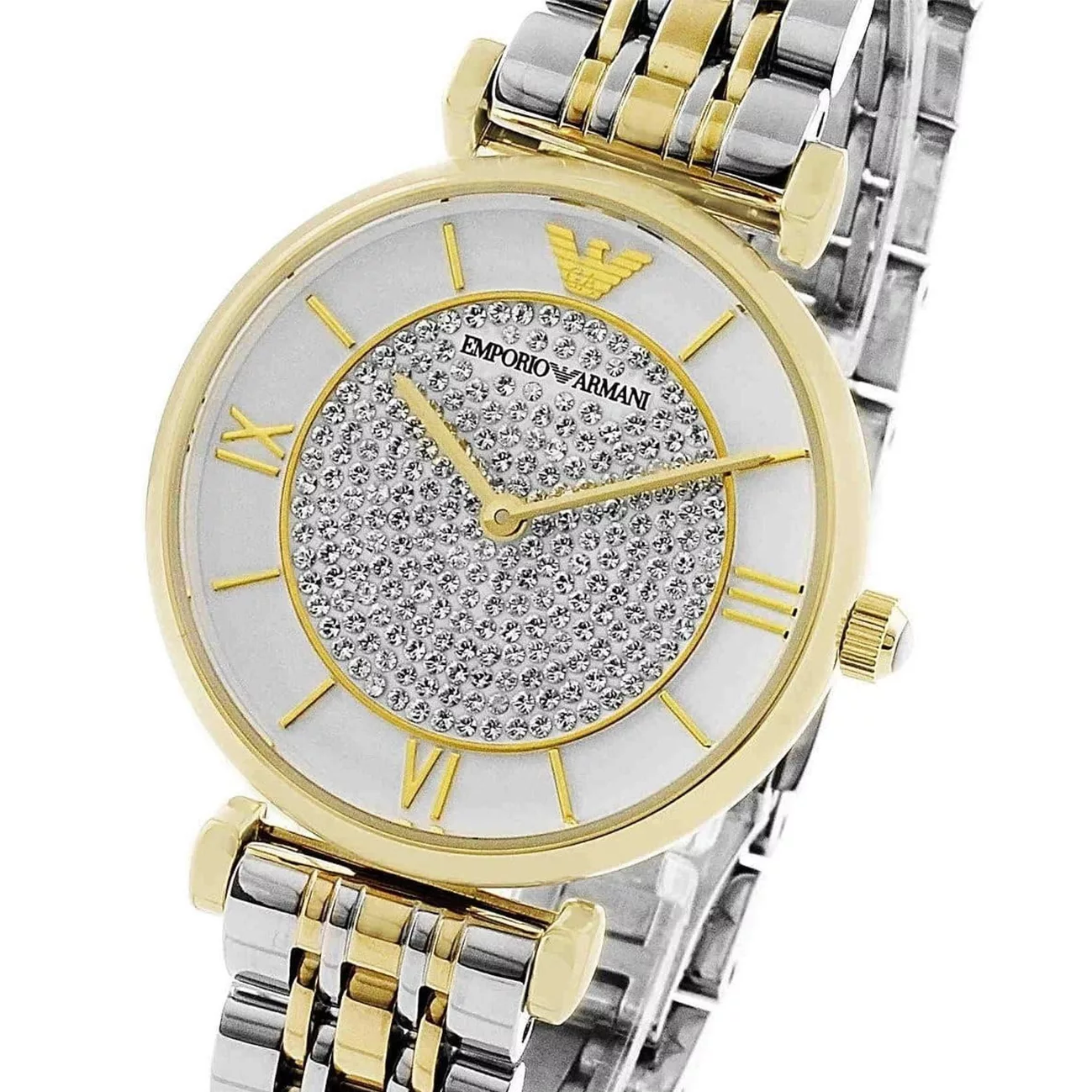 Emporio Armani AR2076 is a bedazzling beauty for women who love to shine. Subtle silver bracelet with gold accents and gold stainless steel case. Snow white dial with glowing inlay. Roman numerals on the hour markings add gravitas.The scratch resistant dial is protected by a mineral glass. Powered by Quartz. Perfect accessory to stand out among the crowd and highlight your vibrant style with confidence. This ultra bold and eye-catching statement will become an absolute staple in your wardrobe.