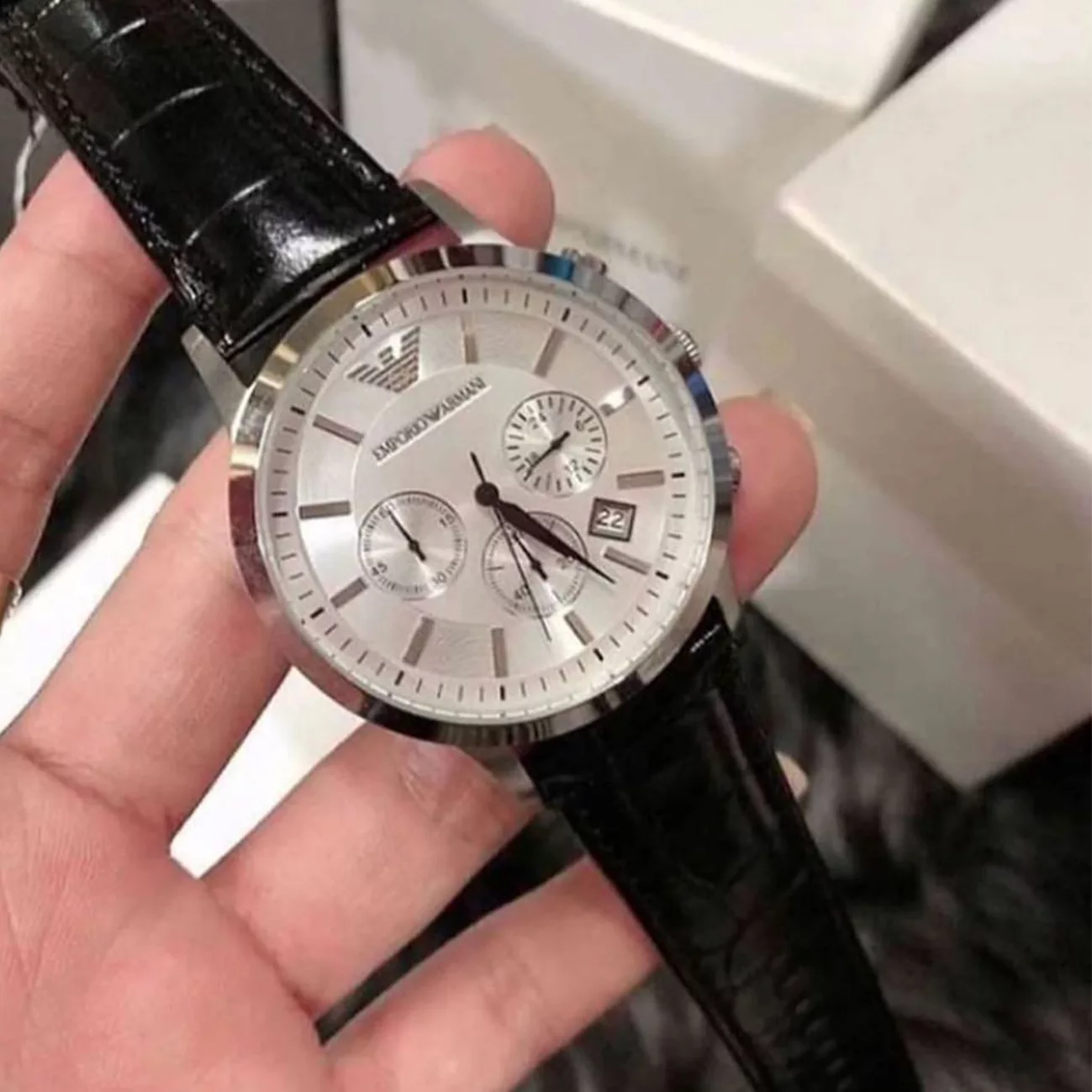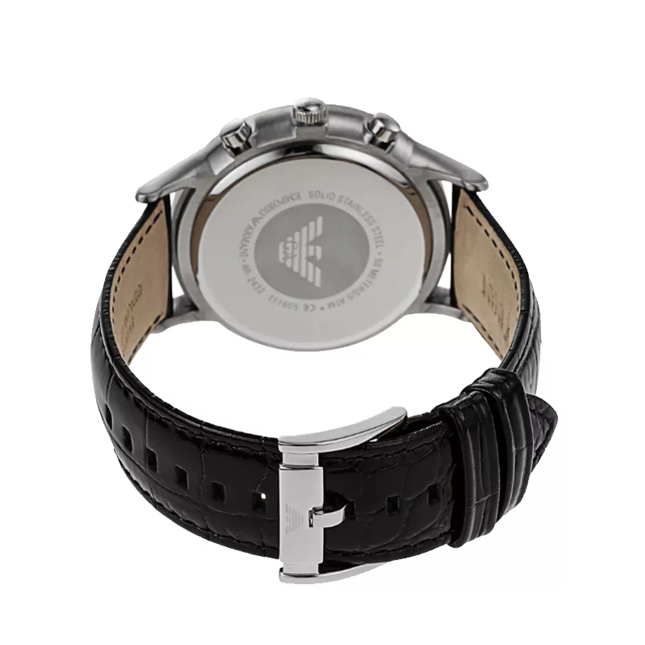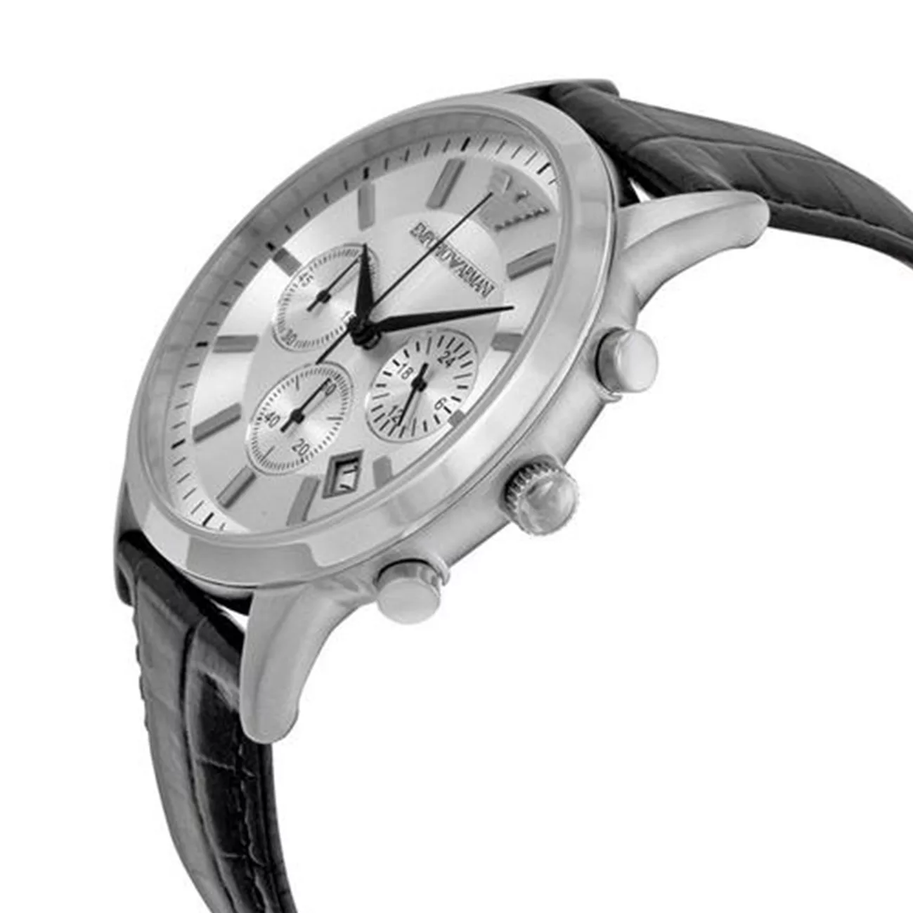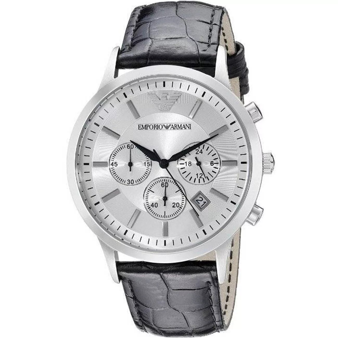 Emporio Armani AR2432 is a stylish and sophisticated chronograph for men who are looking for a reliable accessory for every day. The black lacquered strap adds a unique touch. Silver stainless steel case with matching dial signature logo 3-subdial chronograph and a date section will not let time pass by. The scratch resistant dial is protected by a mineral glass. water-resistant and can be submerged up to 30 meters deep. Powered by Quartz.”