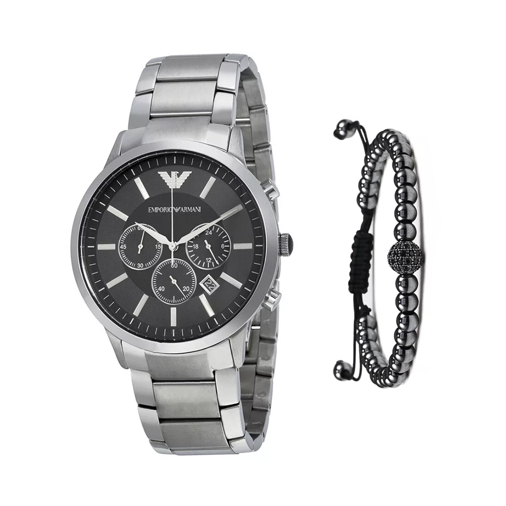 Emporio Armani AR2460 is a stark and stylish chronograph for men, crafted with fine taste. The silver stainless steel bracelet makes up a timeless pair with matte black dial, adorned by a silver signature logo, index markings, hands and three sub-dial chronographs. Powered by Quartz. Water-resistant and protected by mineral glass against mechanical damage. Elegant accessory with a classic look and commitment to modernity.