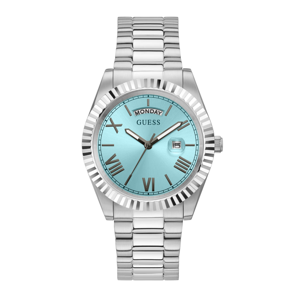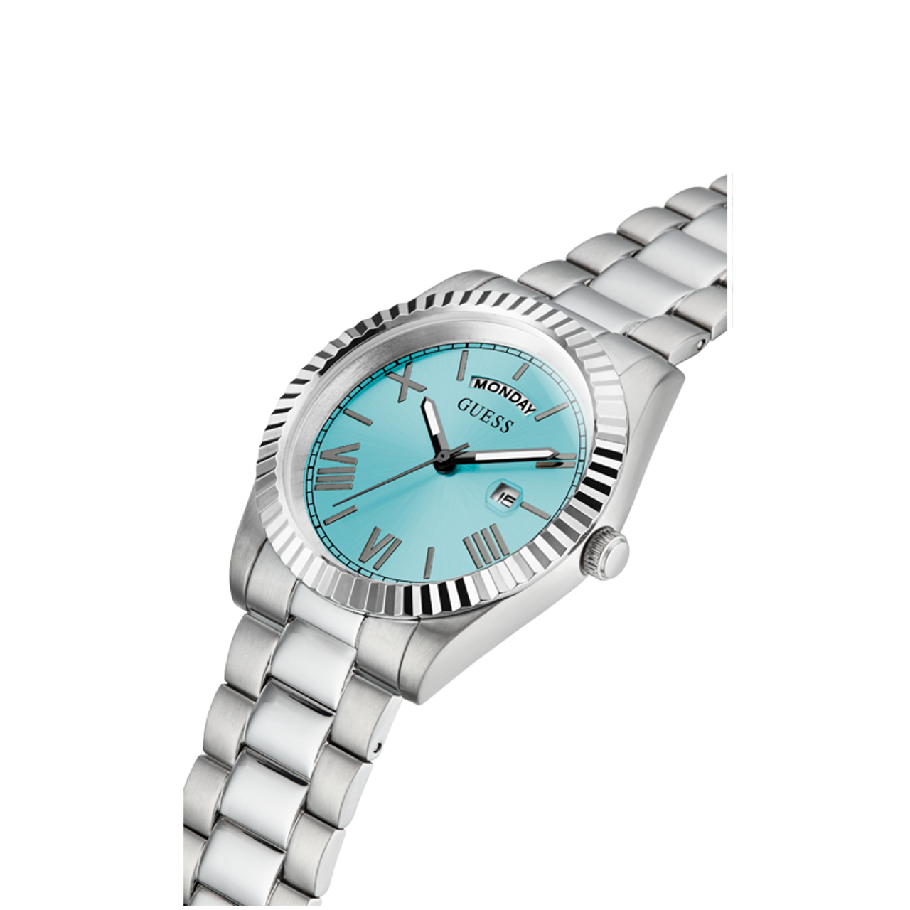 Stand out with fresh sophistication in the GUESS GW0265G11 — a modern timepiece that blends classic design with bold color. Featuring a 42mm round stainless steel case in a sleek silver-tone finish, this watch is elevated by a vibrant turquoise dial accented with Roman numerals and index markers.