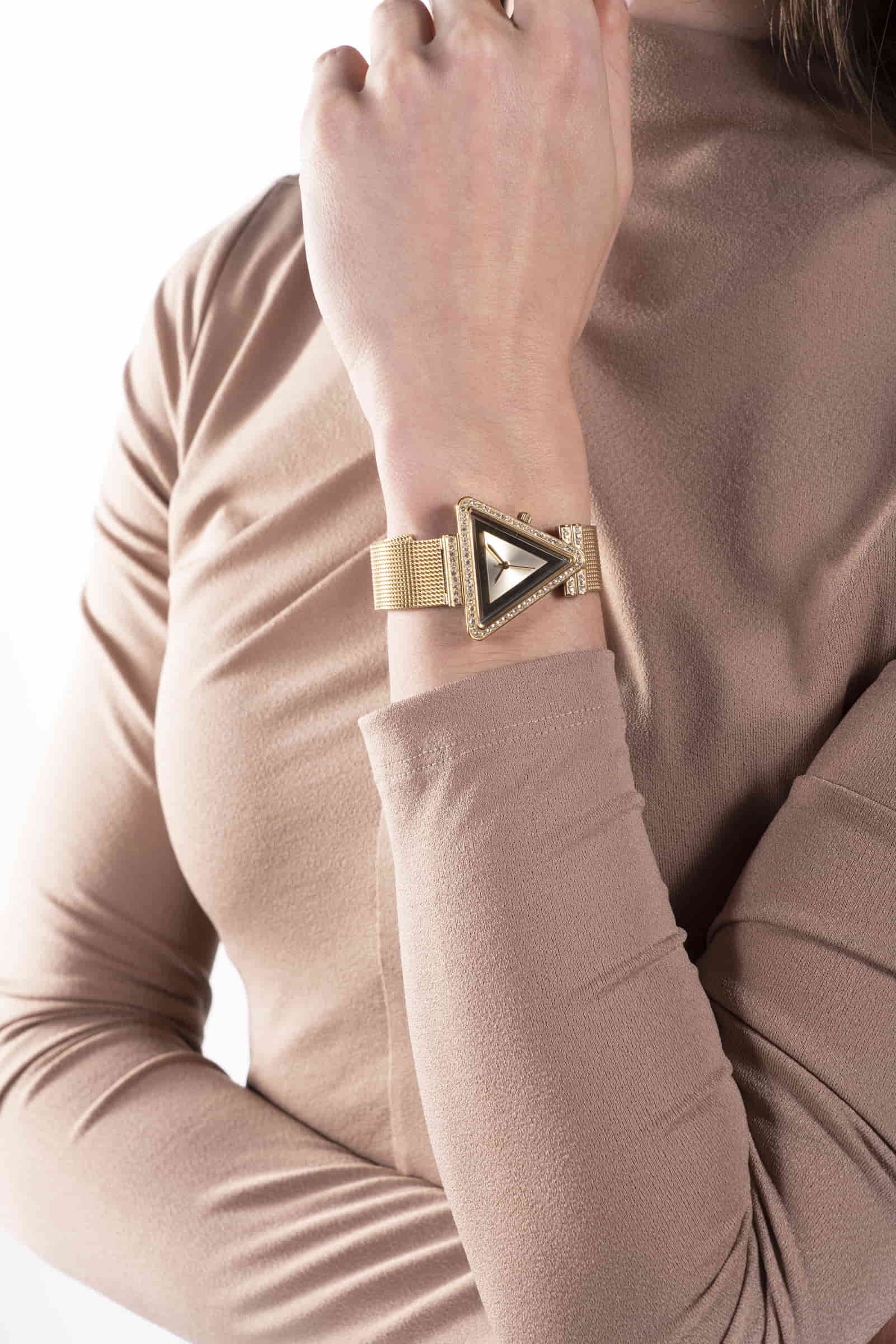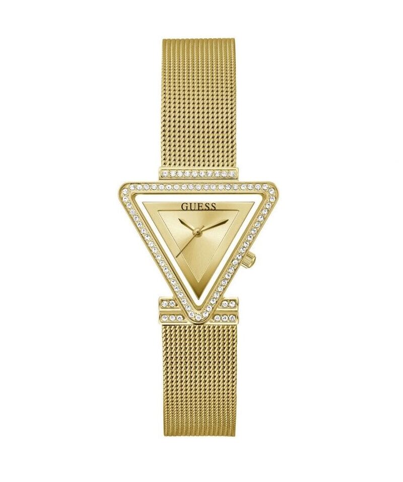 Chic and unconventional, the GUESS GW0508L2 is a standout accessory featuring a bold triangular case design in a radiant yellow gold-tone finish. Measuring 34mm, the polished gold case is paired with a sleek gold-tone dial and a matching stainless steel mesh strap for a sophisticated, unified look.