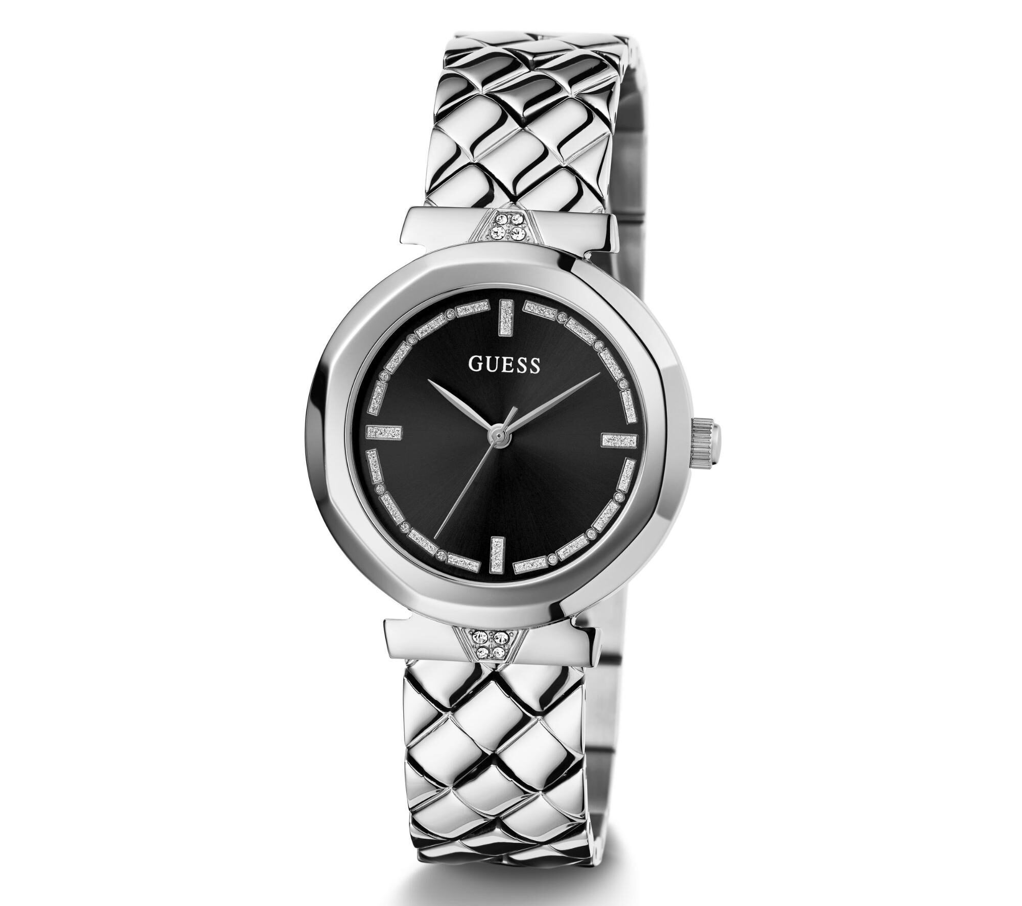 Chic and sophisticated, the GUESS GW0613L1 is designed to bring refined sparkle to your everyday look. Featuring a 34mm silver-tone stainless steel case and a black dial adorned with shimmering crystal accents, this timepiece balances bold contrast with feminine elegance.