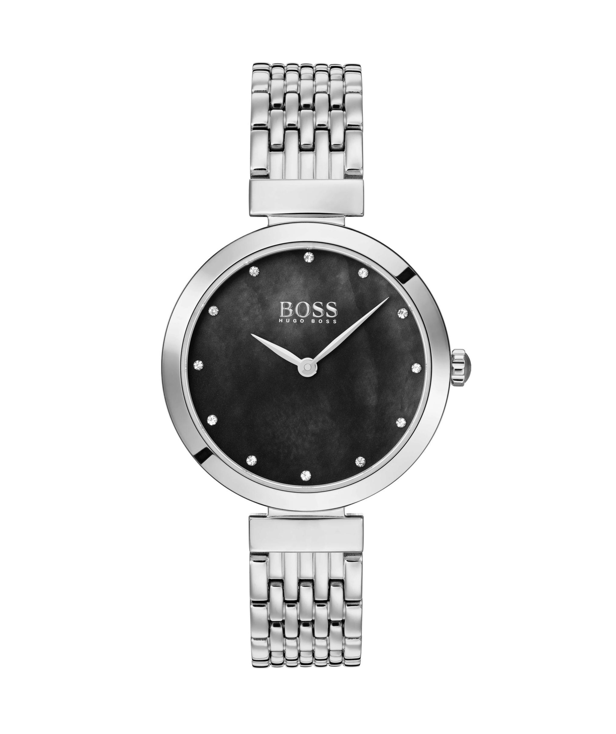 Hugo Boss HB1502478 is an understated and elegant model that shows attention to detail and an eye for classic style. Silver stainless steel bracelet creates a beautiful and timeless contrast with black pearl dial adorned by cubic zirconia over the hour markings. Powered by Quartz. Water-resistant and protected by mineral glass against mechanical damage. Classy and reliable what is more to wish?