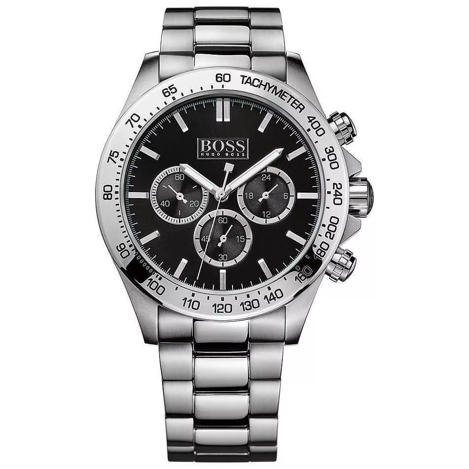Hugo Boss HB1512965 is a sleek chronograph for men who value style and substance. Crafted from silver stainless steel with polished finish this model features a 44 mm black dial with three black subdial chronograph and a date window to never miss your time. Features a tachymeter function. Water-resistant and protected by a mineral glass. With its style and functionality this watch will become your lifeline for every day.”