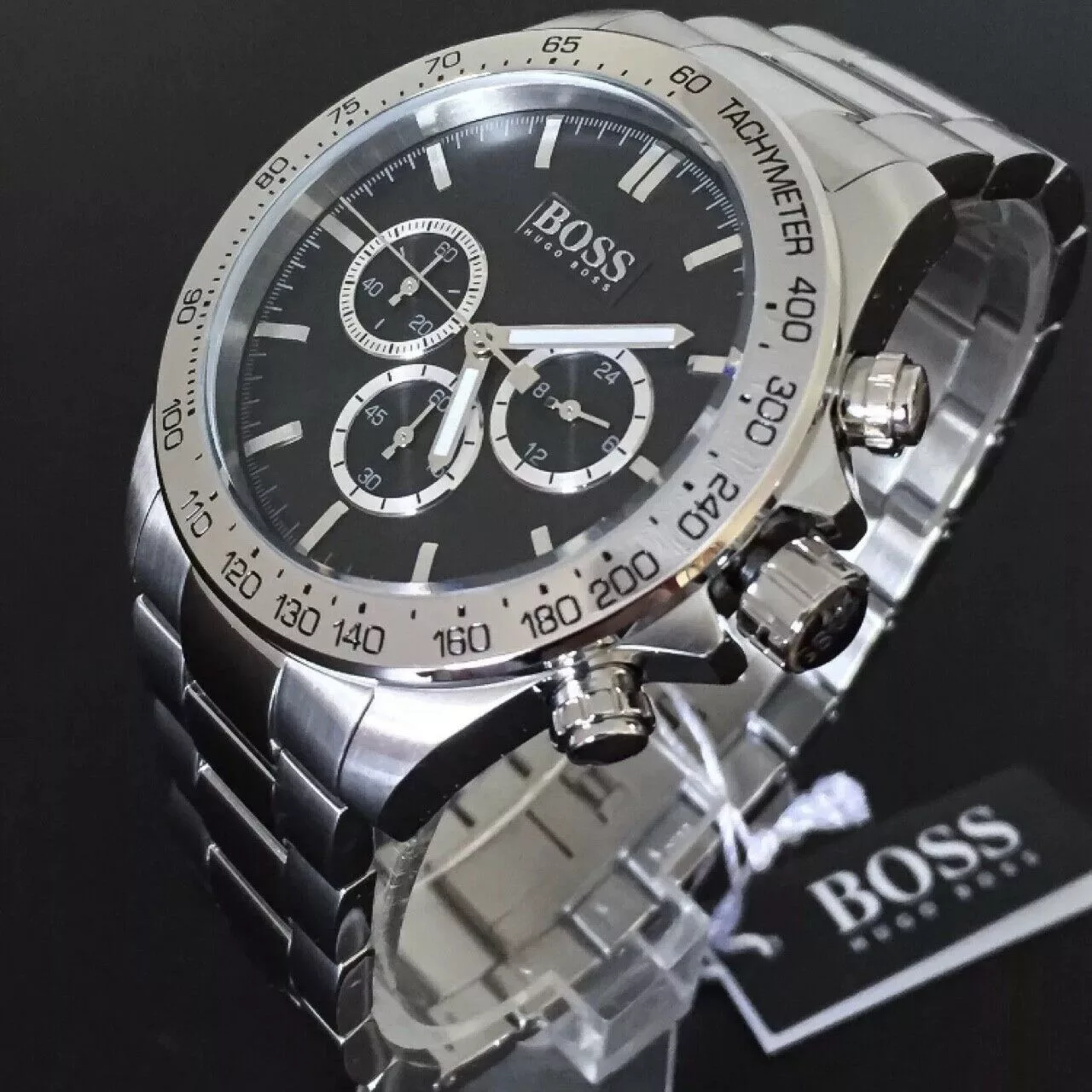 Hugo Boss HB1512965 is a sleek chronograph for men who value style and substance. Crafted from silver stainless steel with polished finish, this model features a 44mm black dial with three black sub-dial chronograph and a date window to never miss your time. Features a tachymeter function. Water-resistant and protected by a mineral glass. With its style and functionality, this watch will become your lifeline for every day.
