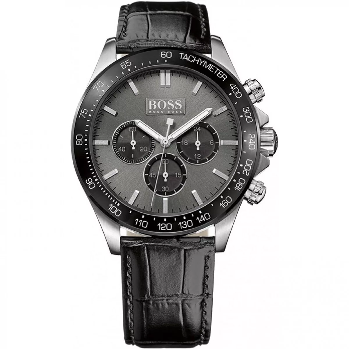 Hugo Boss HB1513177 is in silver and black, featuring a chic dial with high-visibility numeral hour markers and a chronograph function. The watch fastens with a black leather strap. The bright white numbers in the hour markings become the final accent that captures all attention. With its style and functionality, this watch will become your lifeline for every day.