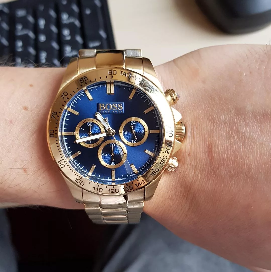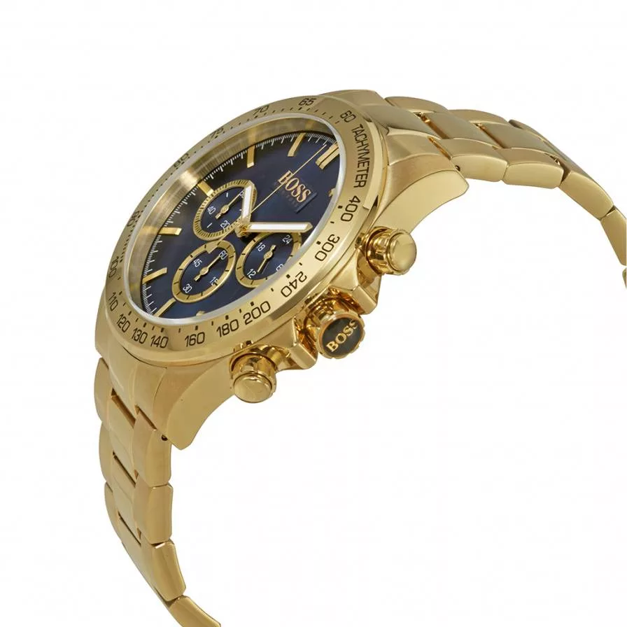 Hugo Boss HB1513340 is gorgeous chronograph watch for men crafted with a fine sense of taste. The gold stainless steel bracelet looks regal with its matching bezel and striking blue sunray dial. Includes tachymeter function and date window. Robust and reliable made of shockproof material that will last for years to come. Wearing this watch you are sure to be associated with elegance and power.