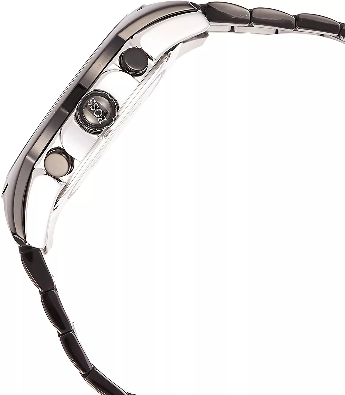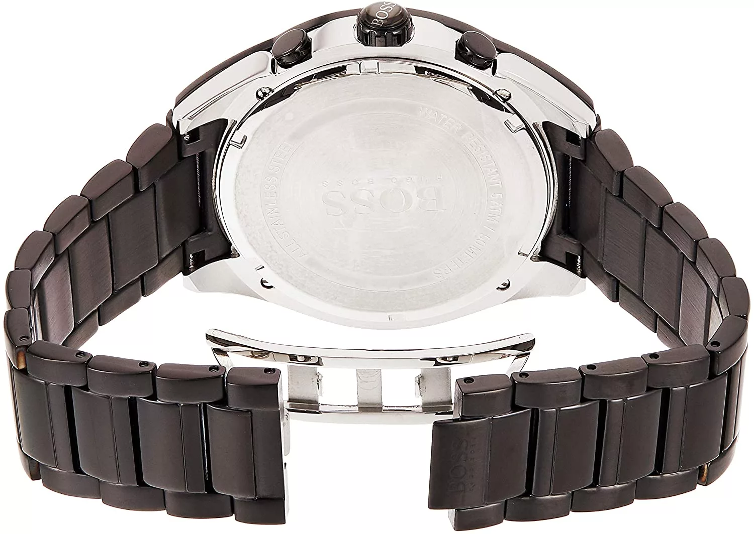 HUGO BOSS HB1513365 Chronograph has a black PVD and polished stainless steel case, and it is powered by a chronograph quartz movement. It is fastened with a black PVD metal bracelet and has a black dial.