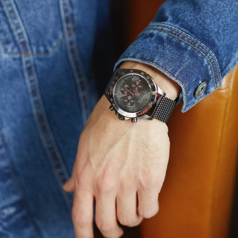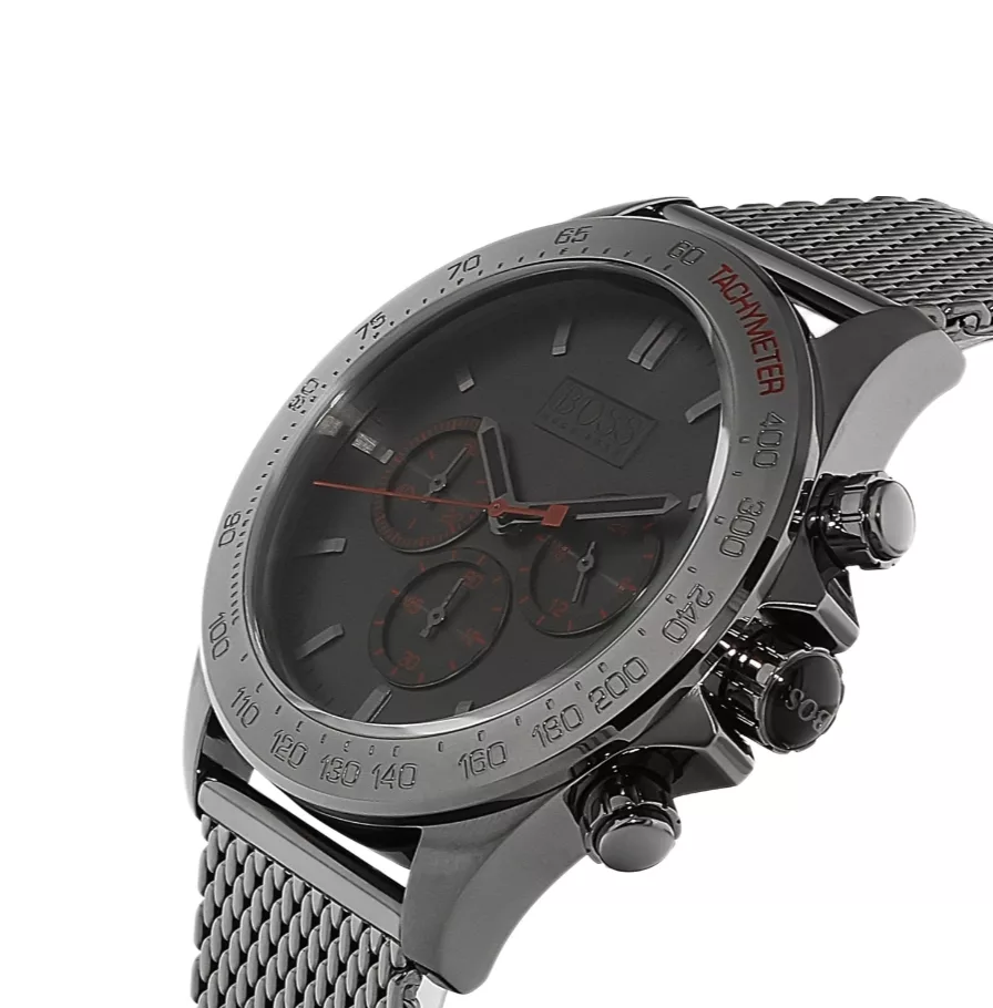 Hugo Boss HB1513443 is made of stainless steel in gray with a matching chronograph dial and complemented by a stylish Milanese loop strap that is comfortable to wear. Red details on the dial add a sporty masculine vibe to the design. Includes tachymeter and date window. Water-resistant and can be submerged up to 50 meters deep. This watch will be a striking accent on your hand and add power to your look.