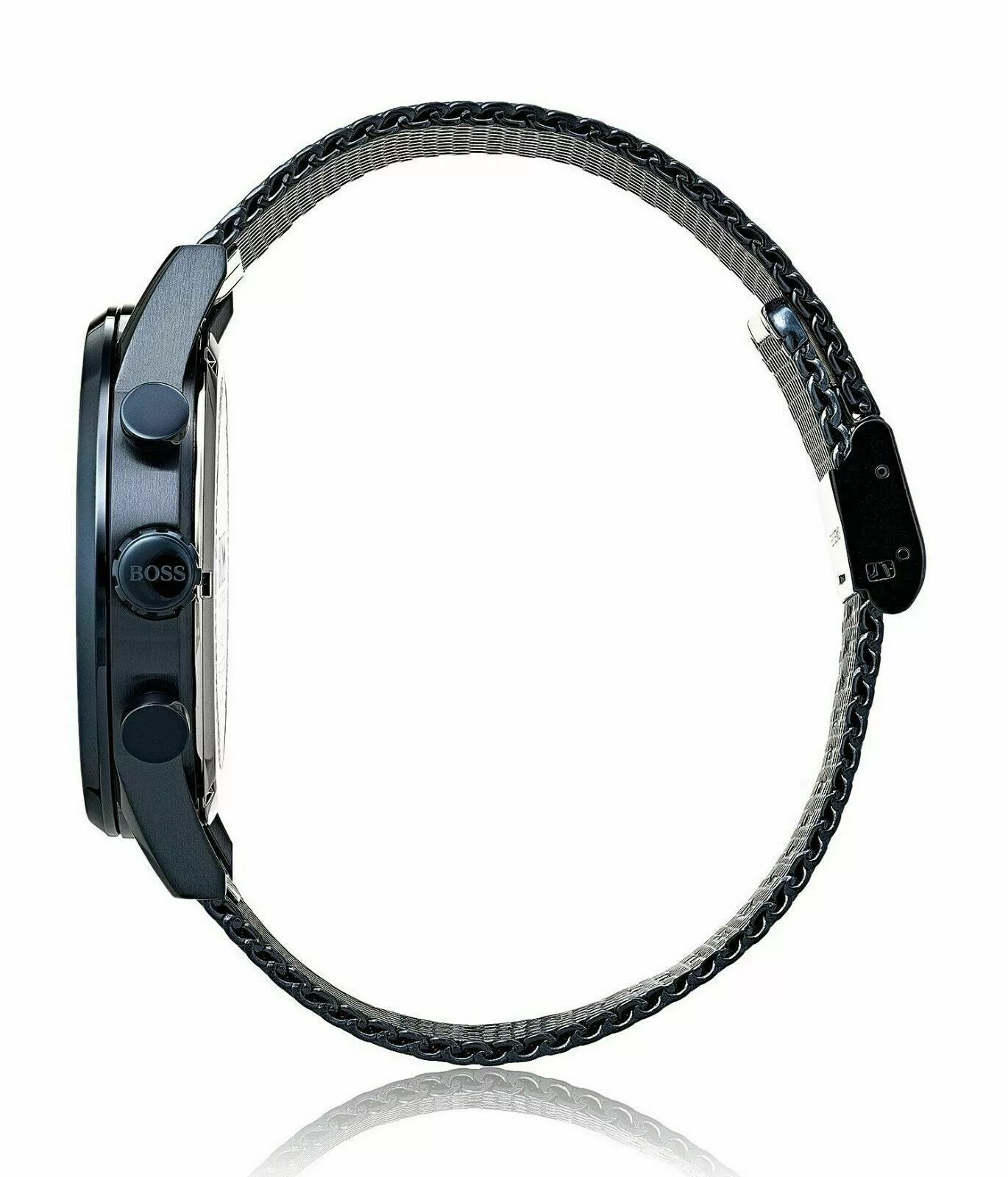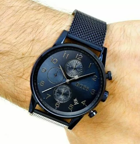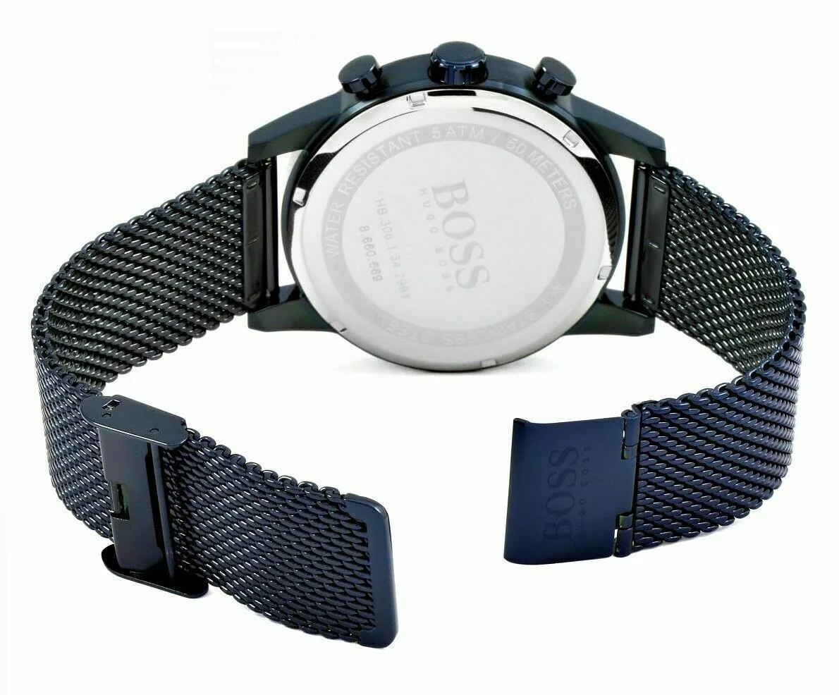 HUGO BOSS HB1513538 GQ Edition Navigator has a blue ion PVD stainless steel case and is powered by an analogue chronograph quartz movement. It fastens a blue ion plated metal mesh bracelet and has a blue dial.