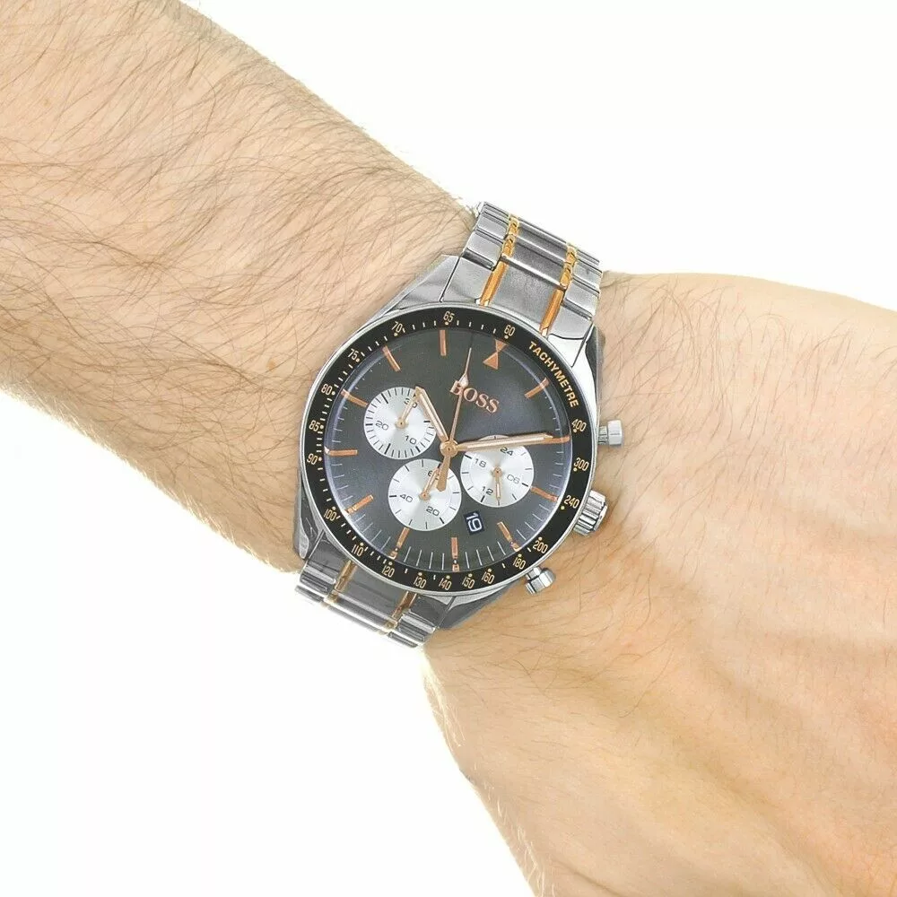 Hugo Boss HB1513634 is a reliable and functional sports watch with a confident style. Silver stainless steel bracelet with rose gold elements collaborates perfectly with the black dial. Set with arrows and index markings in rose gold. Features three silver subdial chronograph and tachymeter function. Protected by mineral glass against mechanical damage. water-resistant can be submerged in water up to 30 meters. This watch will become an indispensable companion to your lifestyle.