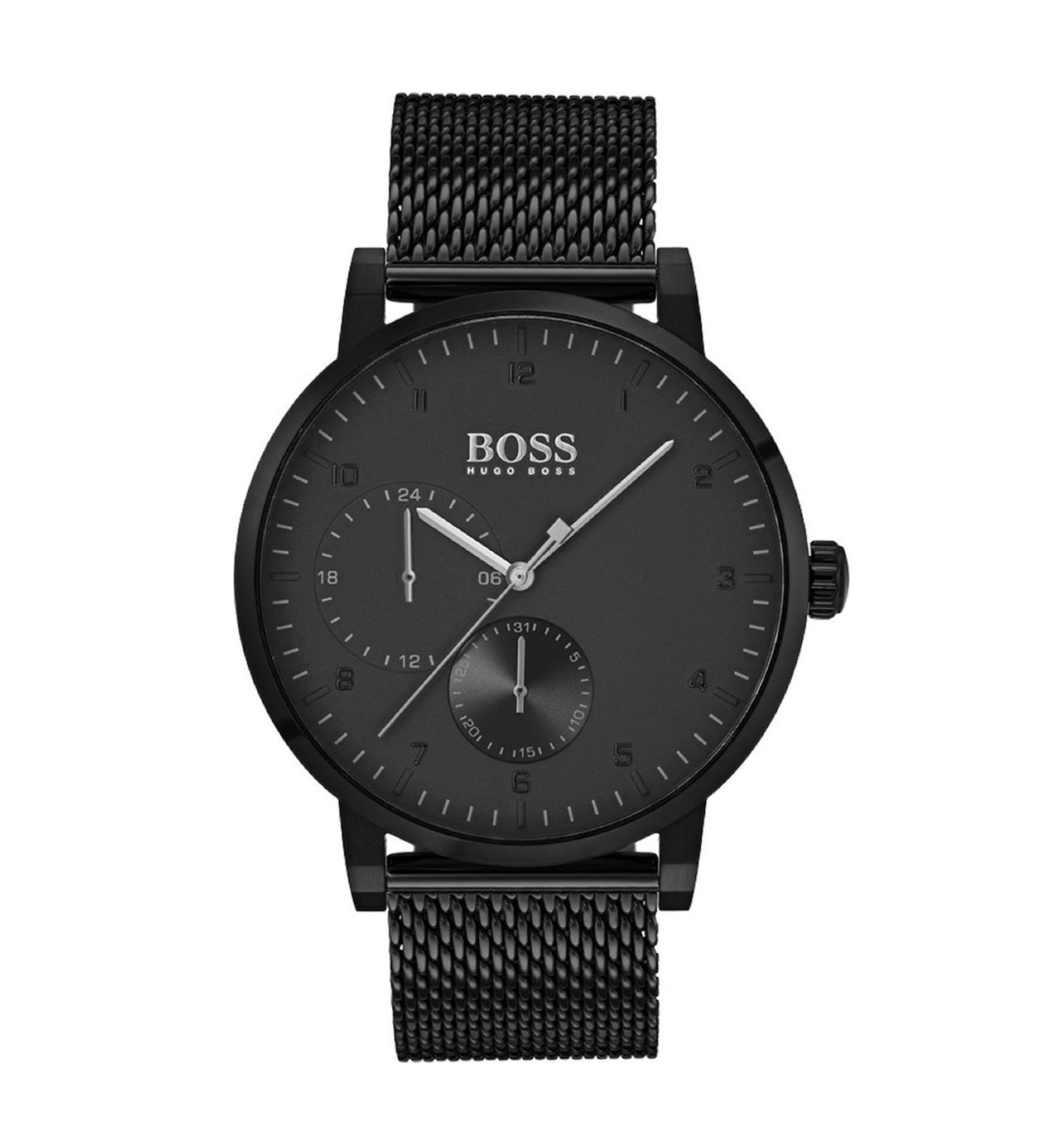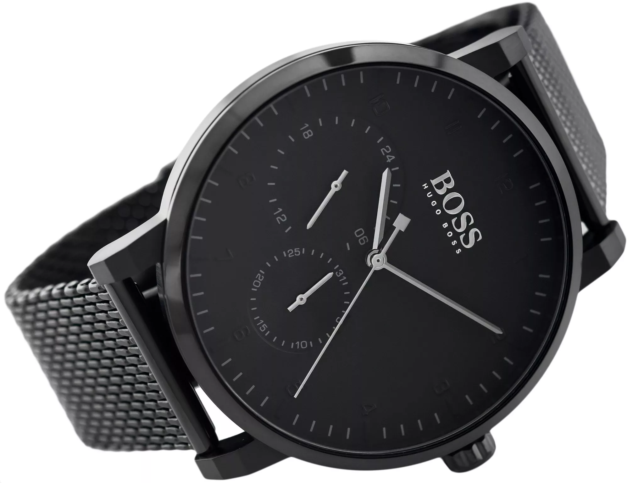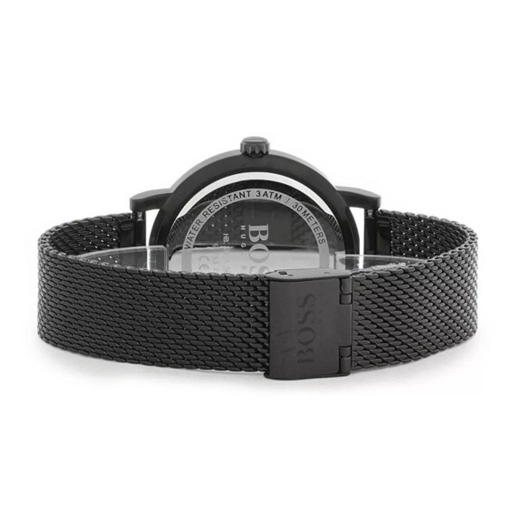 Hugo Boss HB1513636 is a sophisticated watch with minimalistic spirit, crafted from stainless steel. The black Milanese loop bracelet fits perfectly with a black matte dial, adorned by two sundials and silver hands. Secured by a deployment clasp. Water-resistant and protected by a mineral glass against mechanical damage. A sleek and functional accessory to empower your style.