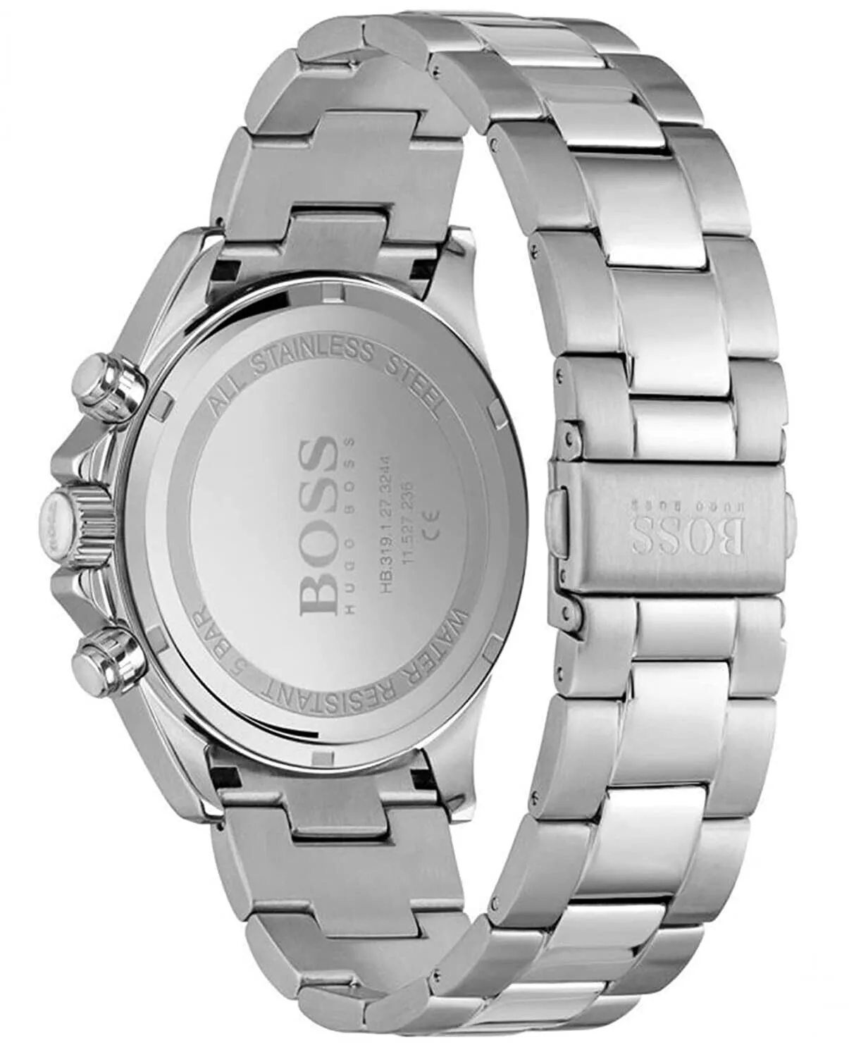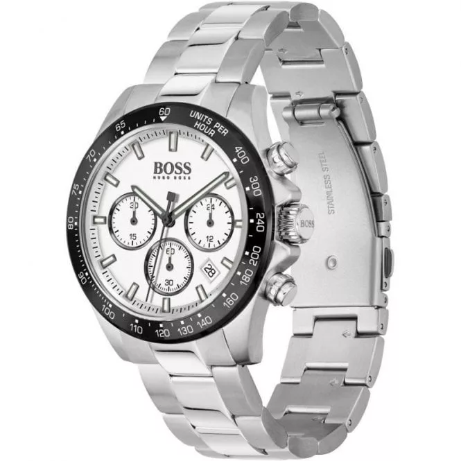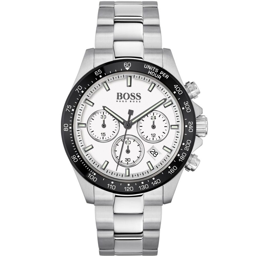 HUGO BOSS HB1513875 Hero is made from stainless steel and is powered by a chronograph quartz movement. It is fastened with a silver metal bracelet and has a white dial.
