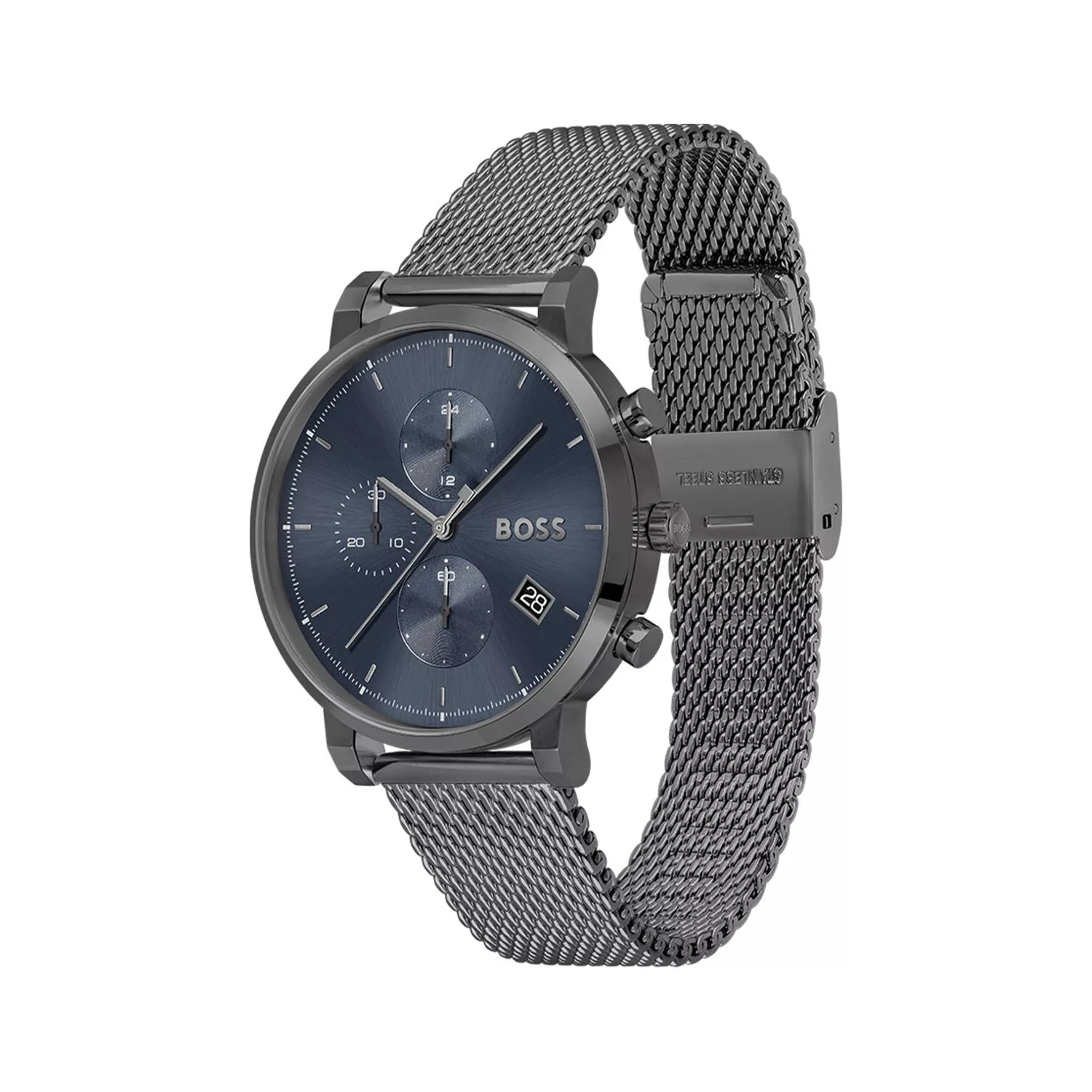 HUGO BOSS HB1513934 Integrity Blue Dial Men’s Watch is a beautiful watch from Hugo Boss with a Quartz timepiece. In addition, this watch features a Mineral watch-glass. The watch is 3 ATM waterproof, and with a strap of Stainless Steel in the color Gray.