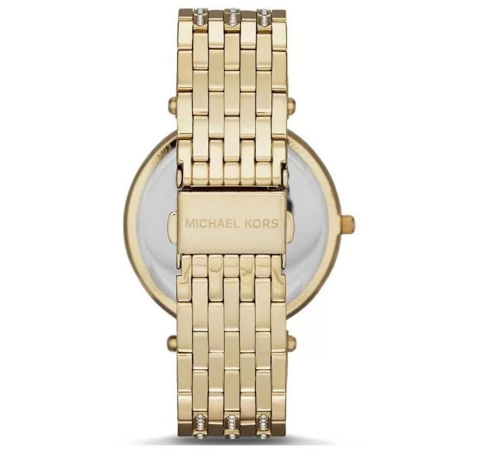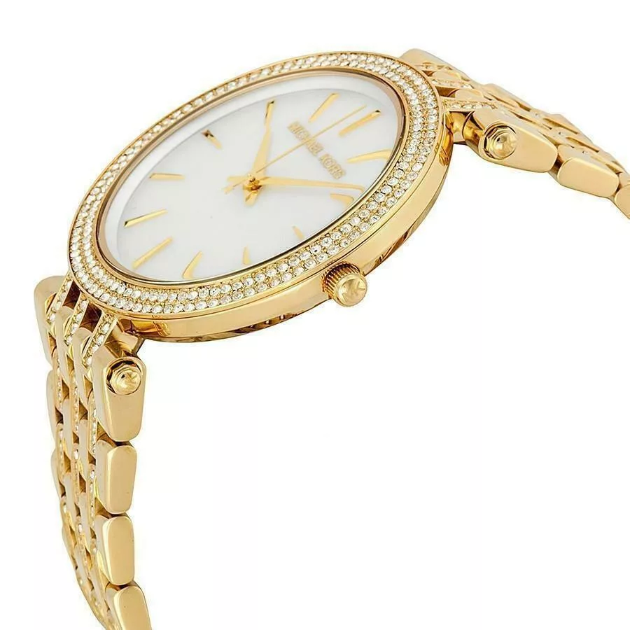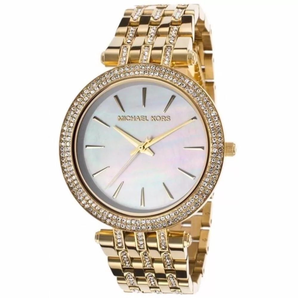 Michael Kors MK3219 is a chic and elegant model for women who appreciate refined details. Crafted from stainless stainless steel with gold PVD coating this watch stands for its beautiful inlaid bracelet and bezel that paired with pearl dial with gold details. Powered by Quartz. Water-resistant and protected by mineral glass against mechanical damage. It is an accessory that brings sophistication and class to the every move you make.