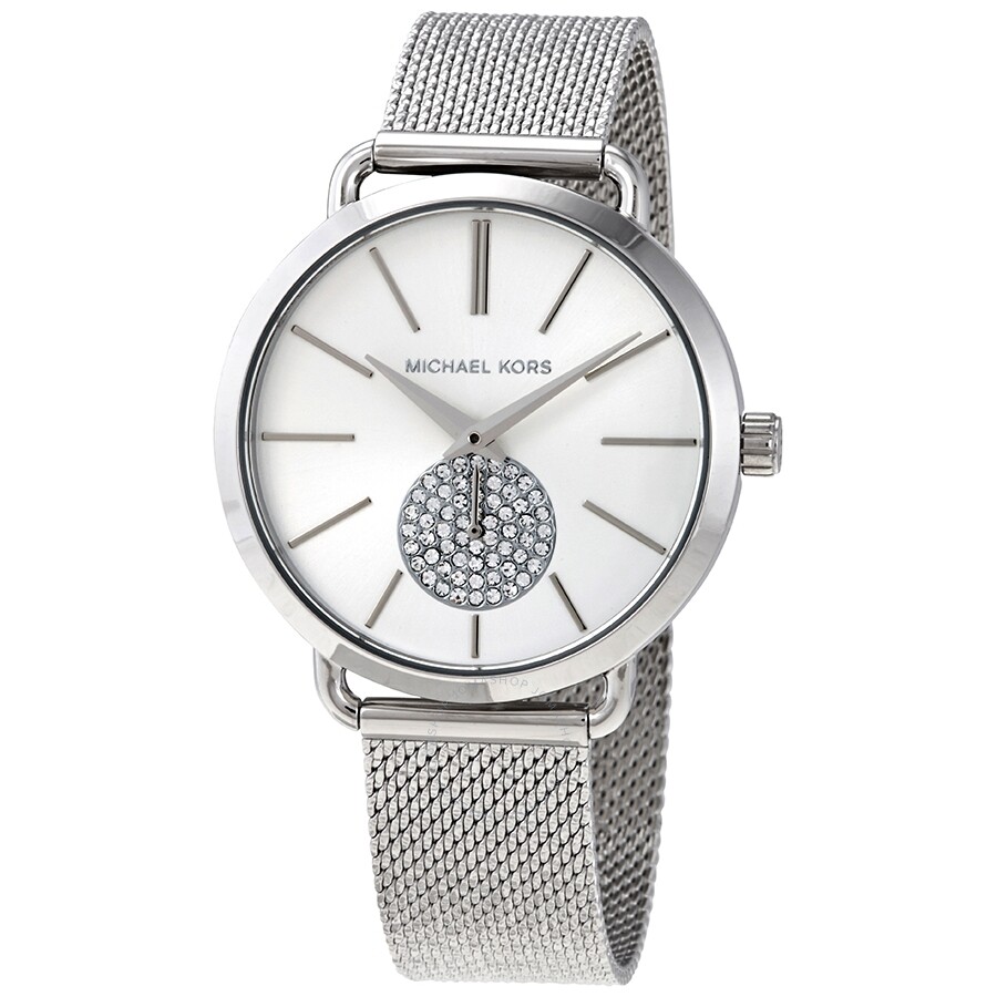 Michael Kors is known for his chic, luxe style, and the Ladies Michael Kors Portia Watch is no exception. The 37mm stainless steel case surrounds a gorgeous silver-toned dial with slender silver hour baton markers, and a sparkly crystal second counter at 6 o’clock. The mesh bracelet adds an extra touch of glam, and the overall effect is a stunning accessory that will complement any outfit.