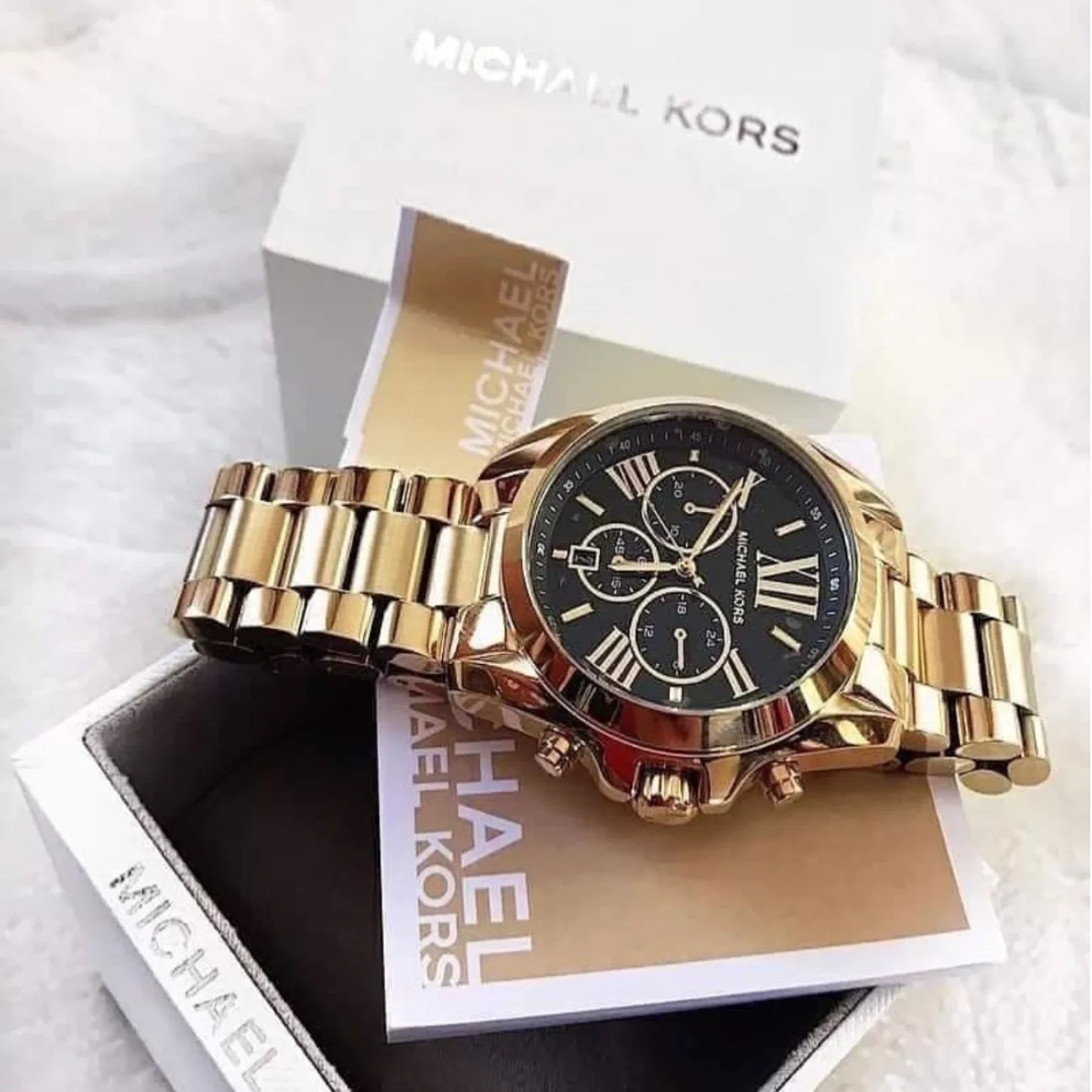Michael Kors MK5739 is a stylish and bold wrist watch for women. A voluminous three-link gold bracelet total black dial adorned with a gold Roman numerals on hour markings and features a three-dial chronograph for maximum functionality. Beautiful and eye-catching classic this is a perfect staple that will show off your character. Water-resistant and can be submerged up to 50 meters. Comes with a 2-year warranty.