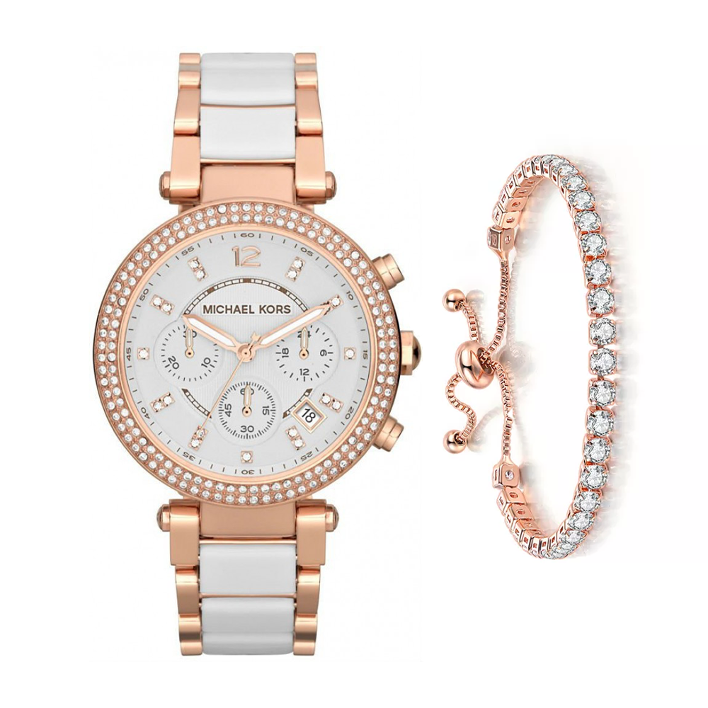 Michael Kors MK5774 is a delicate balance of luxury and style. The rose gold case, crafted in stainless steel, is complemented by a matching bracelet with white insertions. Wide rose gold bezel inlaid with cubic zirconia for an ultra-spark. The three-dial chronograph will not let any second of your time pass you by. This timepiece will add a bit of masculine energy to your look and elevate your style to a new level. The watch is water-resistant and can be submerged up to 50 meters. Comes with a 2-year warranty.