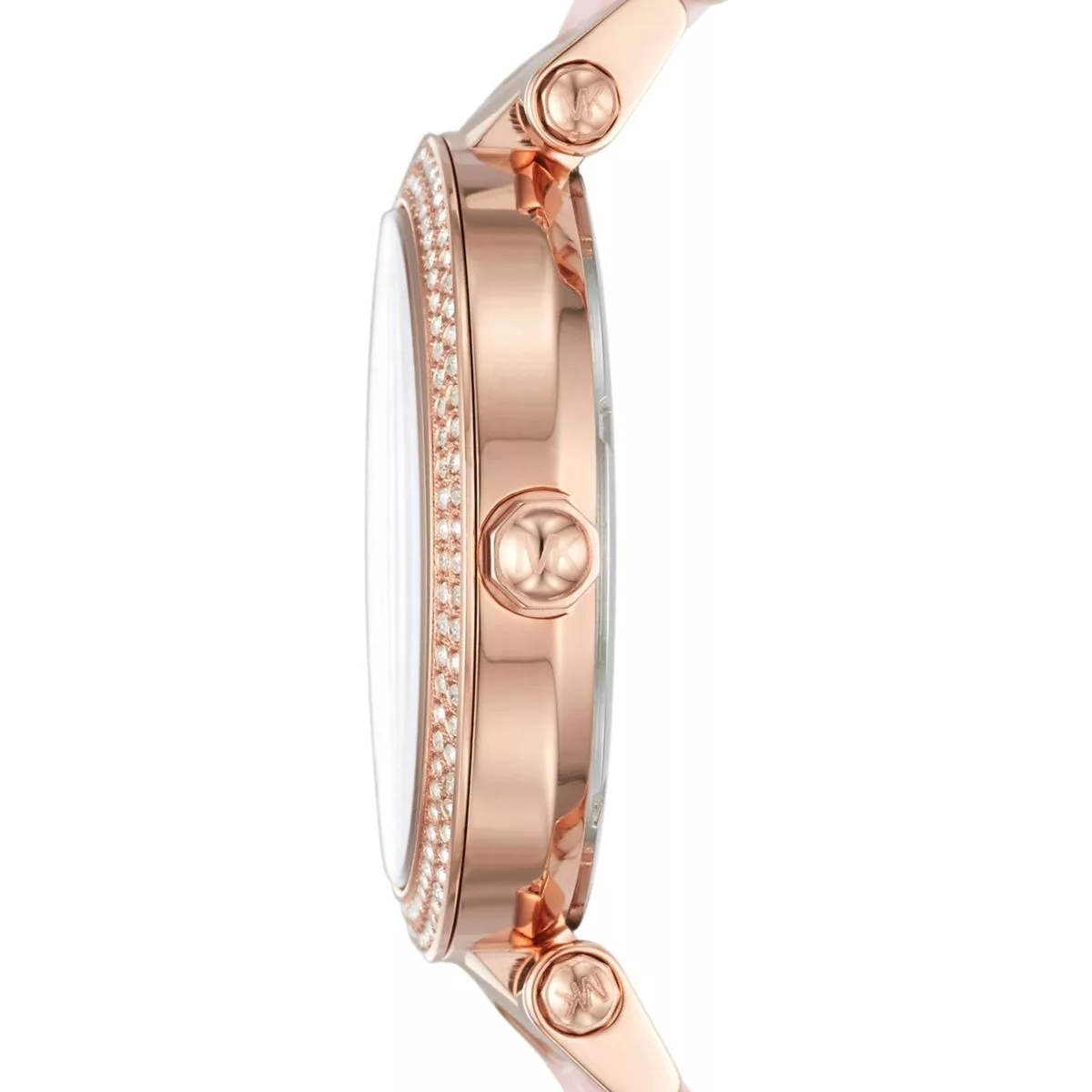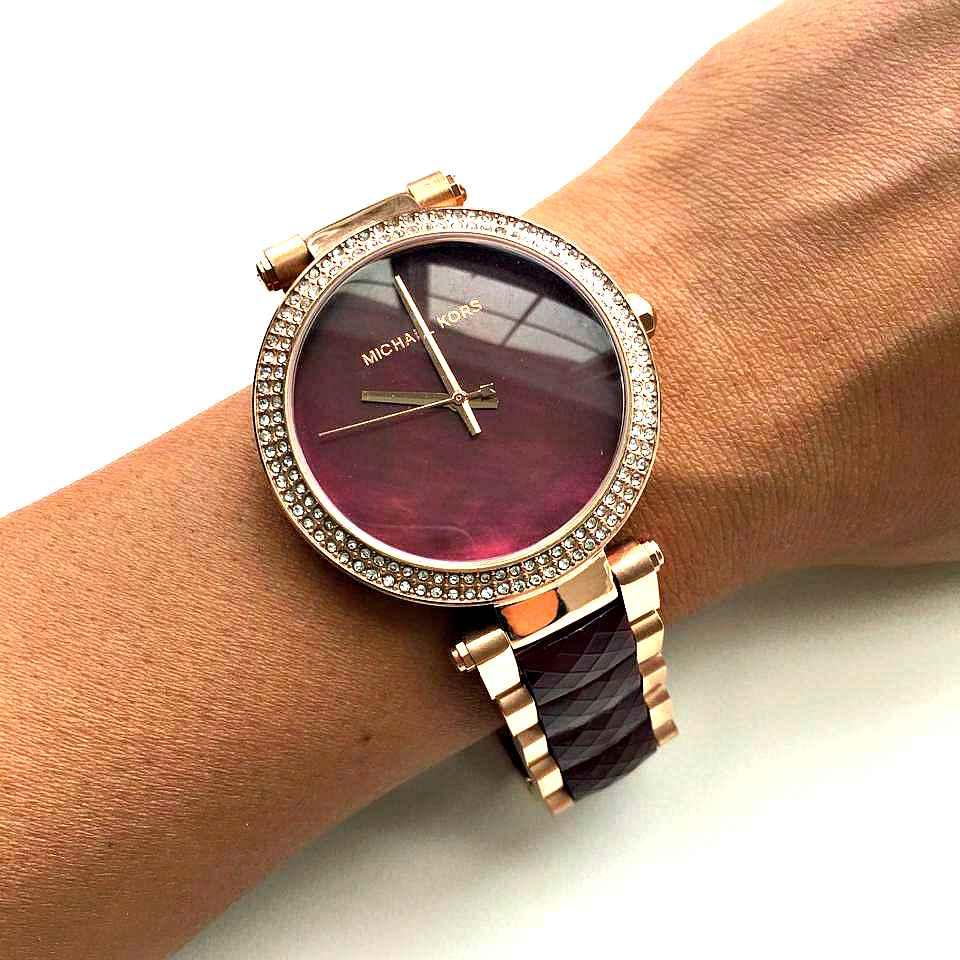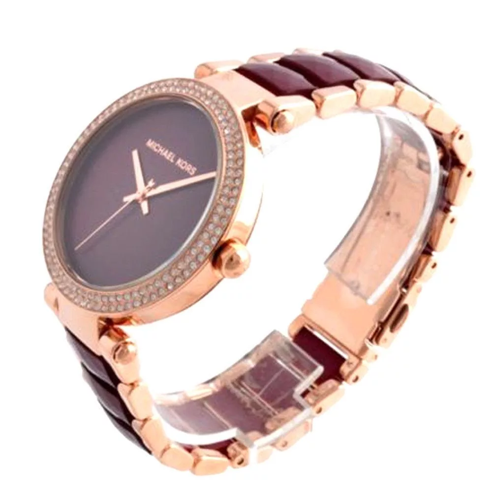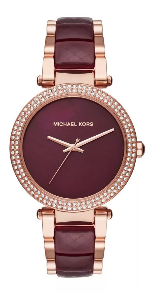 Michael Kors MK6412 is a striking and elegant accessory for women with fine taste. An exquisite bracelet crafted in gold stainless steel with burgundy acrylic insertions sits well on the wrists underlining your every move. Burgundy pearl dial is adorned by encrusted gold bezel maximizing your sophistication. Powered by Quartz. Water-resistant and protected by mineral glass to ensure you a long quality service. It is a unique and distinctive accessory that will make you feel magnificent.”