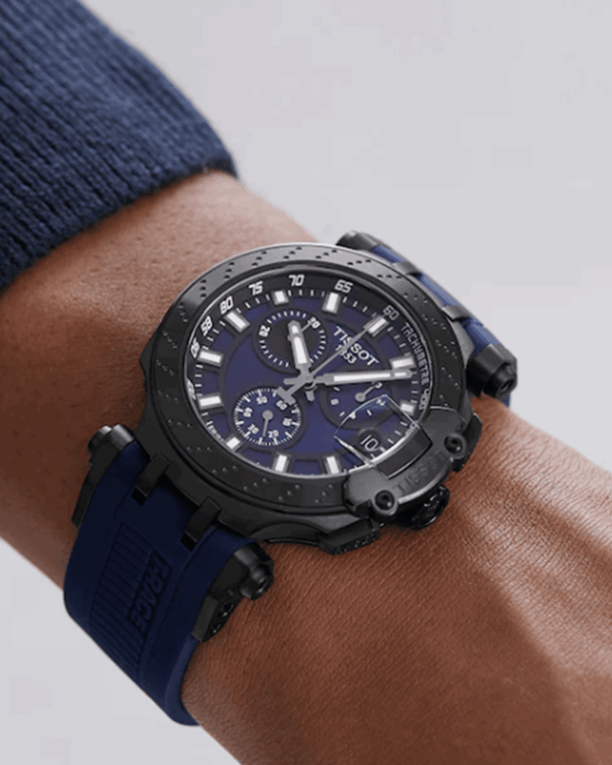 Its 22mm strap with a secure pin buckle closure ensures a comfortable and stable fit. Measuring 12mm in thickness, the T-Race balances a strong wrist presence with refined ergonomics.