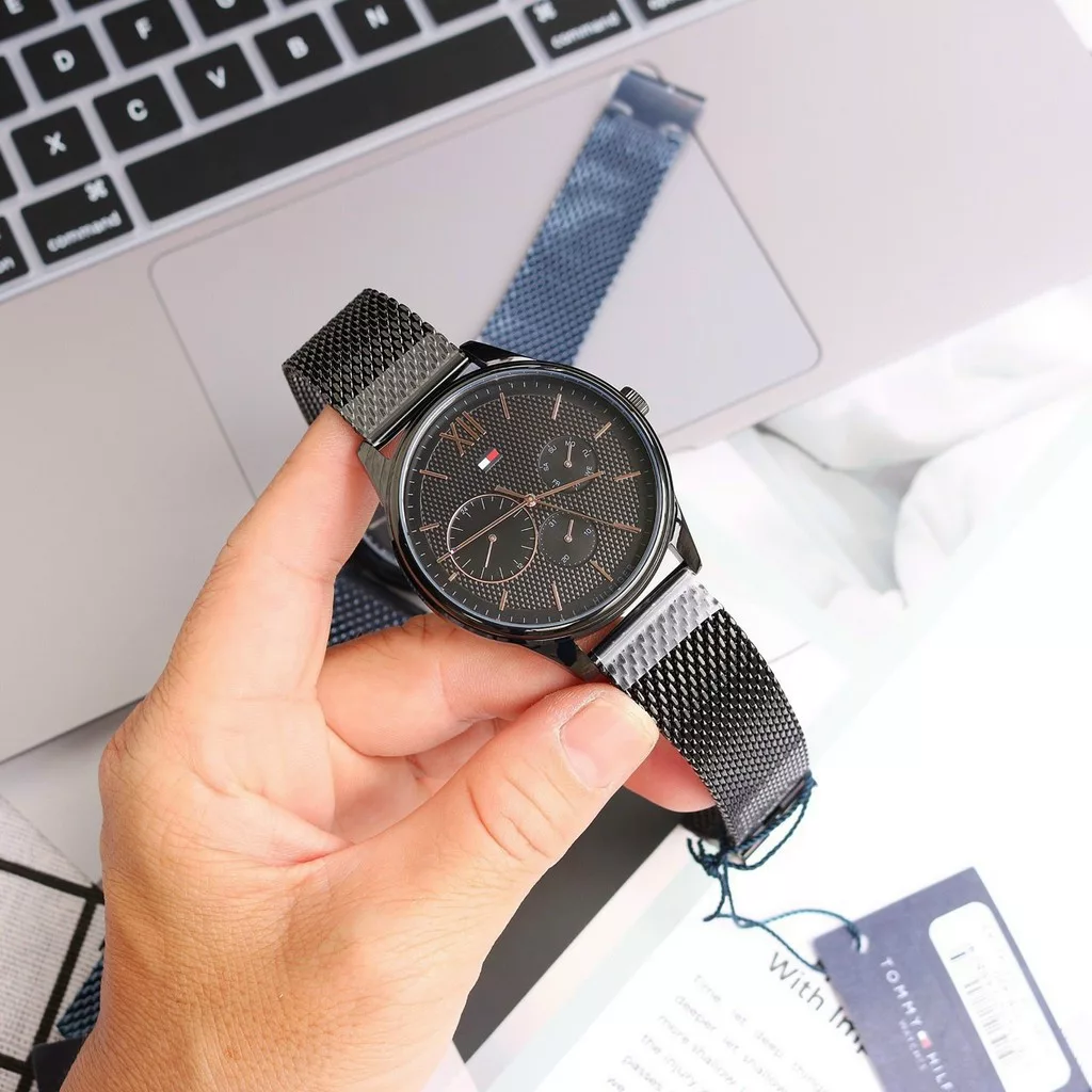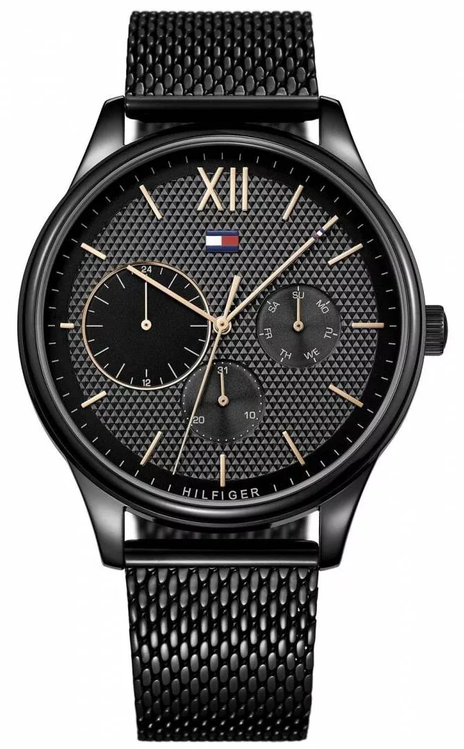 Tommy Hilfiger 1791420 is a multifunctional chronograph for men with a trendy design. Black Milanese loop stainless steel bracelet is combined with textured black dial. It is embellished with rose gold details three subdials and the brand logo. Powered by Quartz. Water-resistant and protected by mineral glass against mechanical damage. Sleek and versatile this watch will take your time under control with style.”