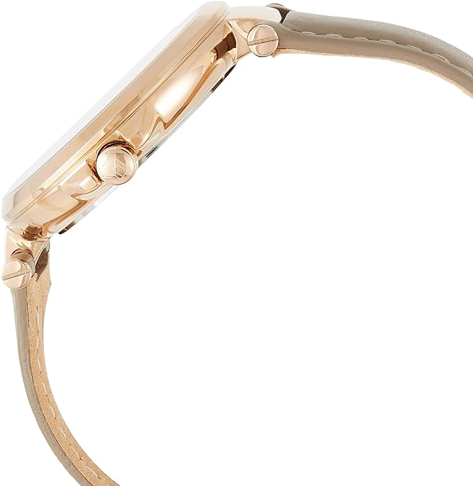 The elegant brown leather bracelet, made from calf leather, adds a touch of luxury to the ensemble. Fastening securely with a tang-type buckle made of rose gold-colored steel, the watch ensures both comfort and style.