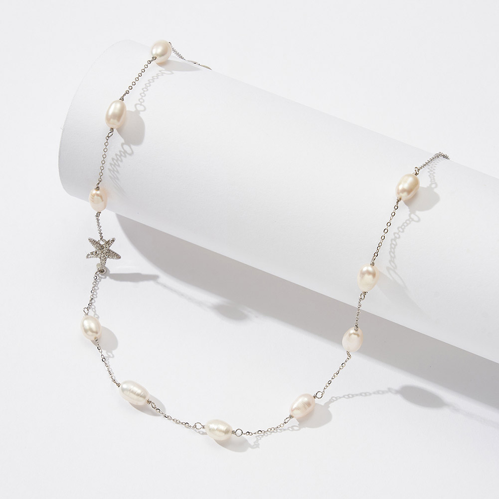 Delicate and celestial, this 925 sterling silver necklace features a charming star accent on the chain, adorned with sparkling 5A clear CZ stones and a lustrous cultured freshwater pearl. Rhodium-plated for a radiant, tarnish-resistant finish, this necklace is crafted to maintain its elegance over time. With an adjustable length of 35.5+7.5cm (14+3 inches), it offers a versatile fit that graces the neckline beautifully. This unique piece is perfect for adding a touch of whimsy and sophistication to any look, making it a thoughtful gift or a lovely addition to her jewelry collection.